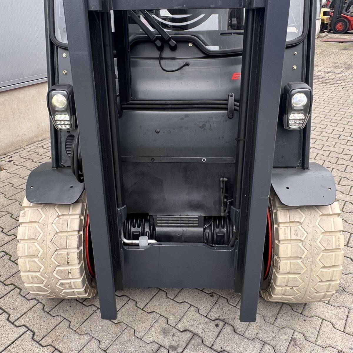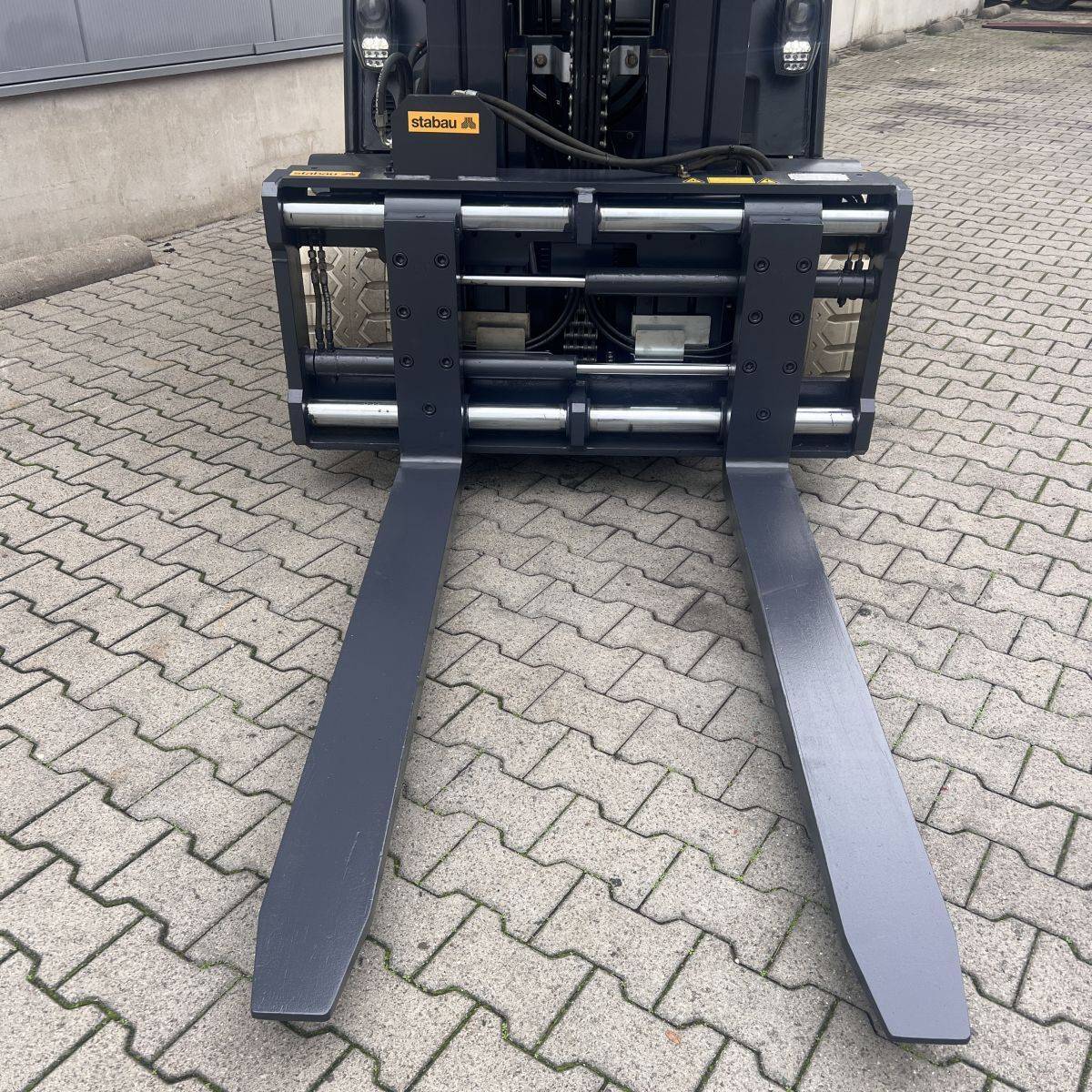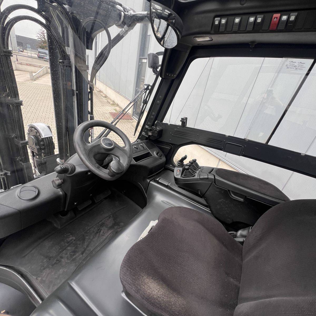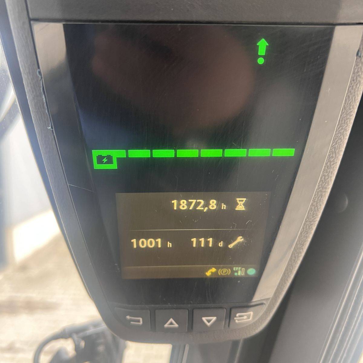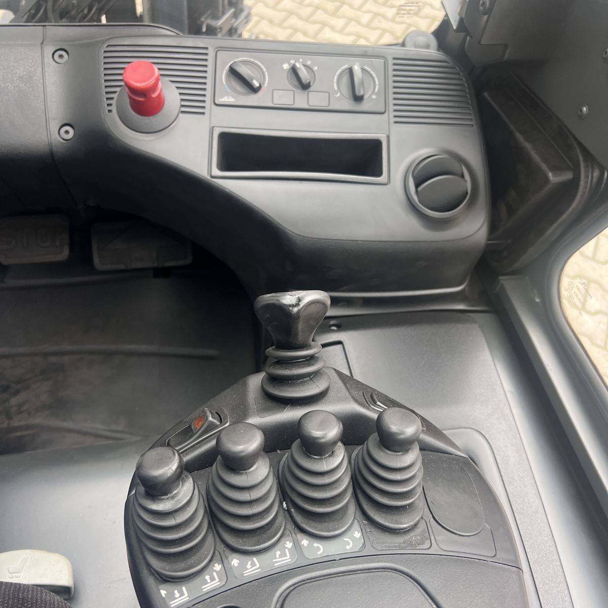 Only 1.870 hours, Load Center 600 mm. Low Container Version: Height of cabin (h6) 2.220 mm. Full cabin, 1 pedal operation, individual levers, heater, roadlights, 3rd and 4th valve, integral forkpositioner / sideshift, bolted forks 1.500 mm. Frame 1.400 mm, opening 400- 1.300 mm over forks. Can also be equipped with normal forkcarriage. Battery 6PzS930 Ah with autofill (2020) . Central greasing system. New Trelleborg Premia Non Marking Tyres.