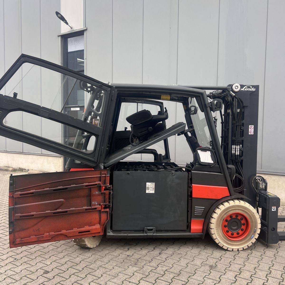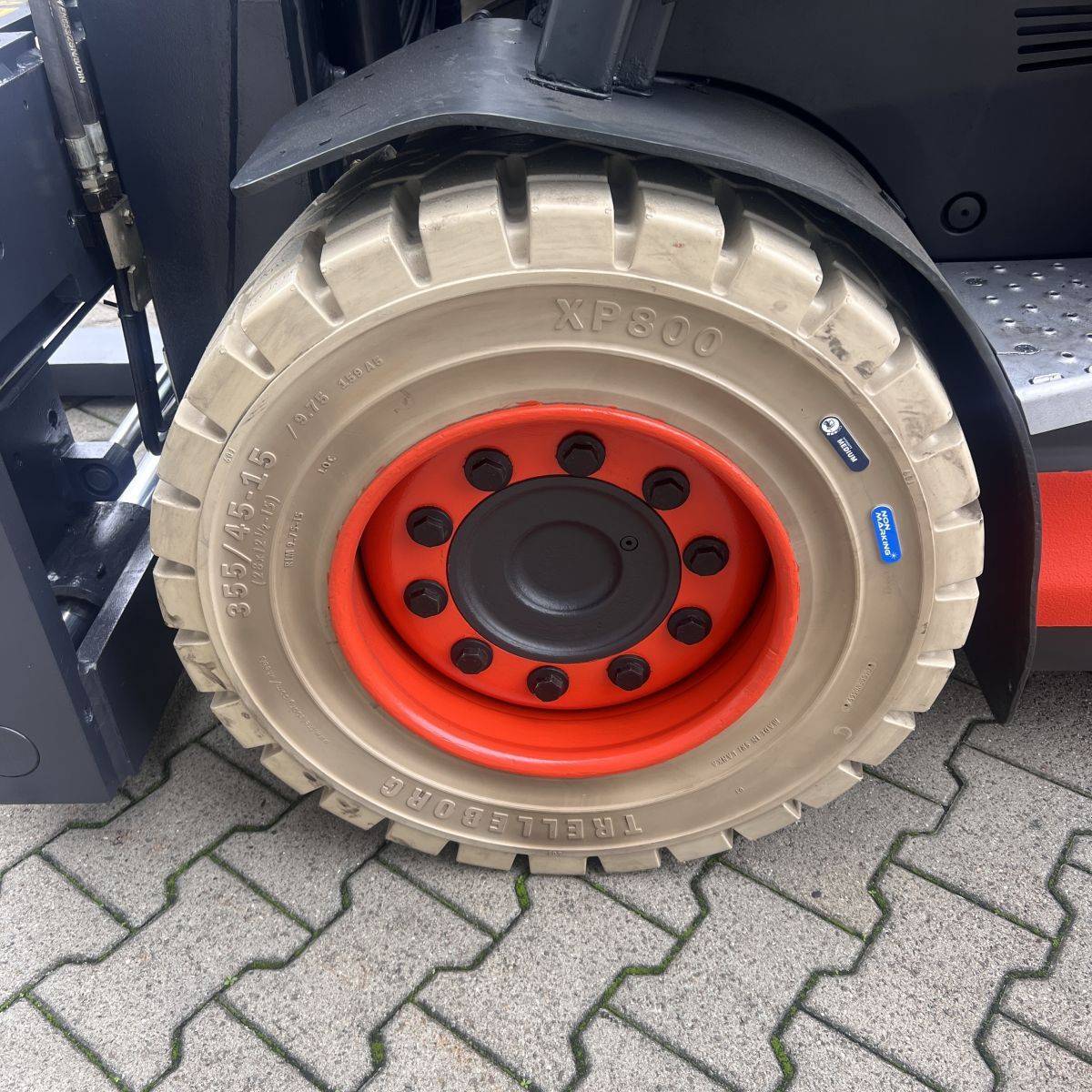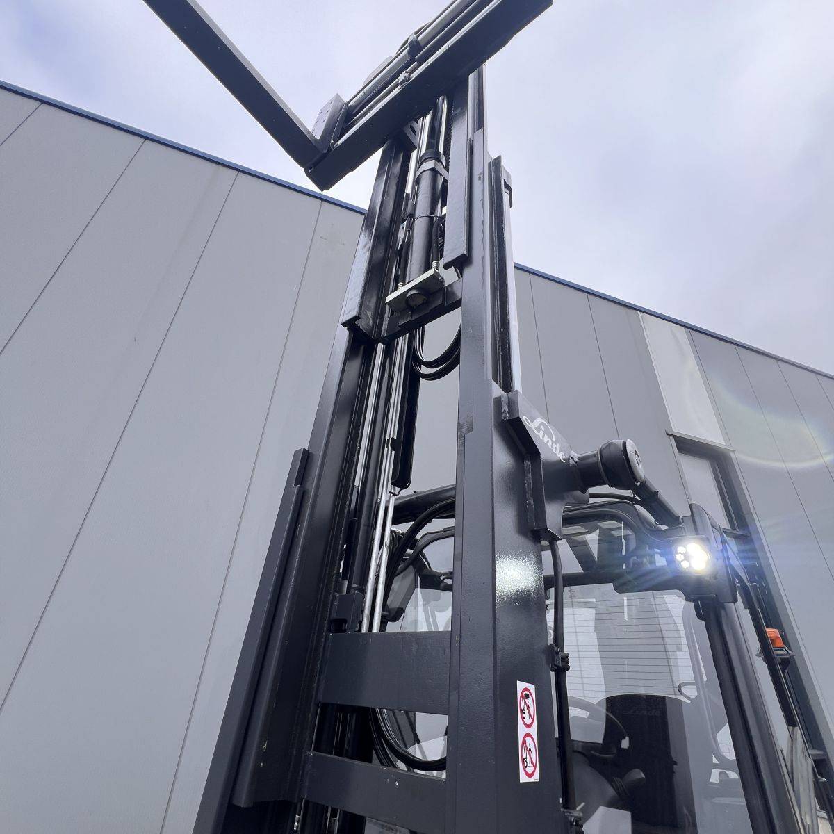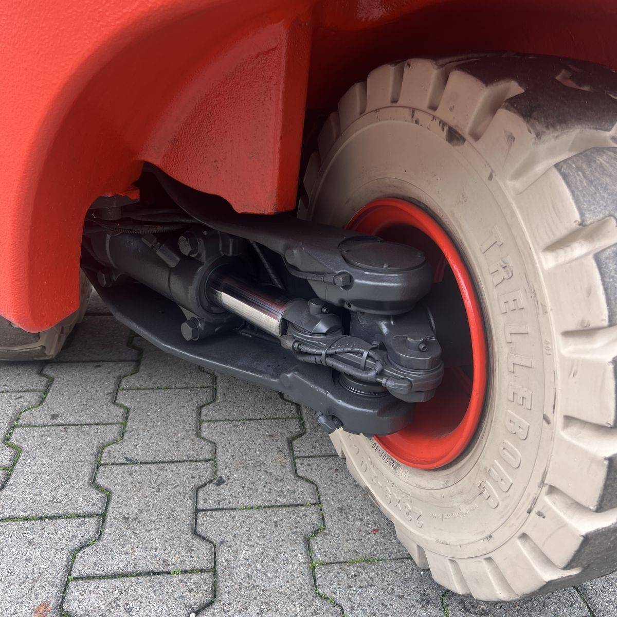 Only 1.870 hours, Load Center 600 mm. Low Container Version: Height of cabin (h6) 2.220 mm. Full cabin, 1 pedal operation, individual levers, heater, roadlights, 3rd and 4th valve, integral forkpositioner / sideshift, bolted forks 1.500 mm. Frame 1.400 mm, opening 400- 1.300 mm over forks. Can also be equipped with normal forkcarriage. Battery 6PzS930 Ah with autofill (2020) . Central greasing system. New Trelleborg Premia Non Marking Tyres.