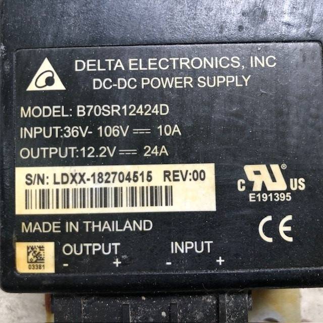 DC/DC-Netzteil von Delta Electronics, Eingang 36–106 V, 10 A, Ausgang 12,2 V, 24 A für Caterpillar EP20ANT/FB20ANT. Ausgebaut aus ETB24A00127, Baujahr 2019, 9.991 Betriebsstunden. Identisch mit Mitsubishi FB20ANT.