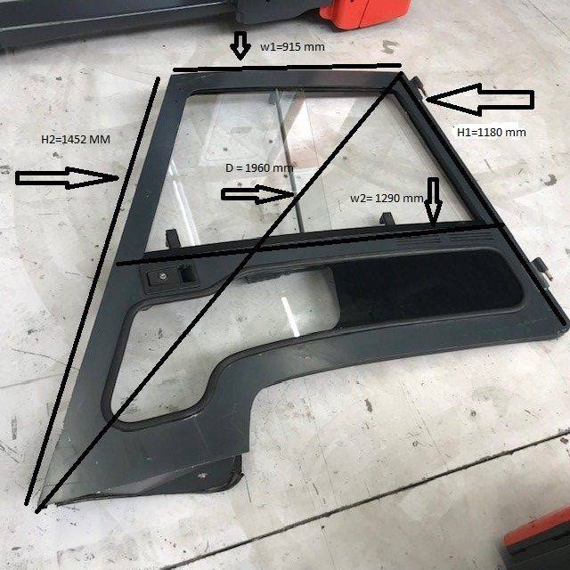 Sehr guter Zustand linke Tür Abmessungen B1 915 mm, B2 1290 mm, T=1960 mm, H1 1180 mm, H2 1452 mm (siehe Foto) f für Linde E25L/E30L/E35L/E25HL-600/E30HL-600/E35HL-600 Serie 387, Ausführung Fahrerschutzdach erhöht, Referenz 2216699, 3874379111