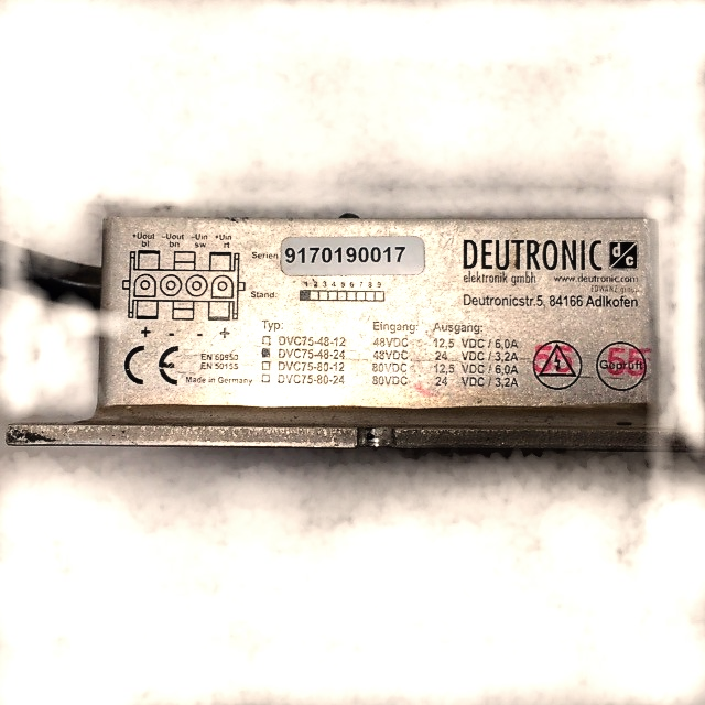 Voltage transformer from Deutronic type DVC 75-48-24, input 48 VDC, output 24 VDC, 3.2 A