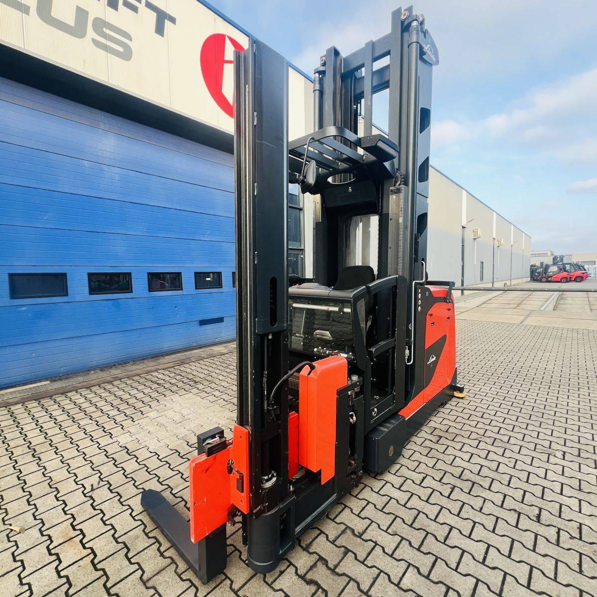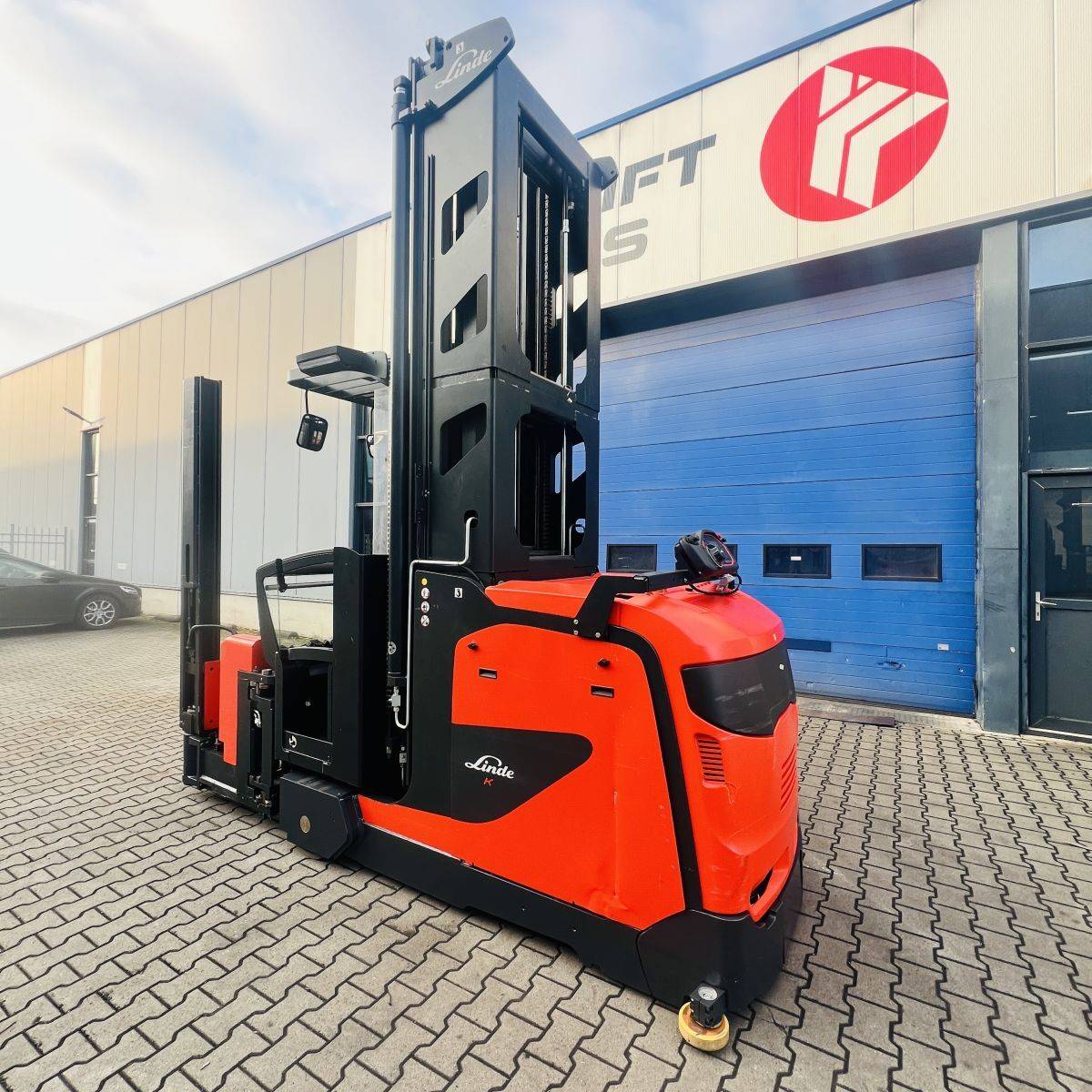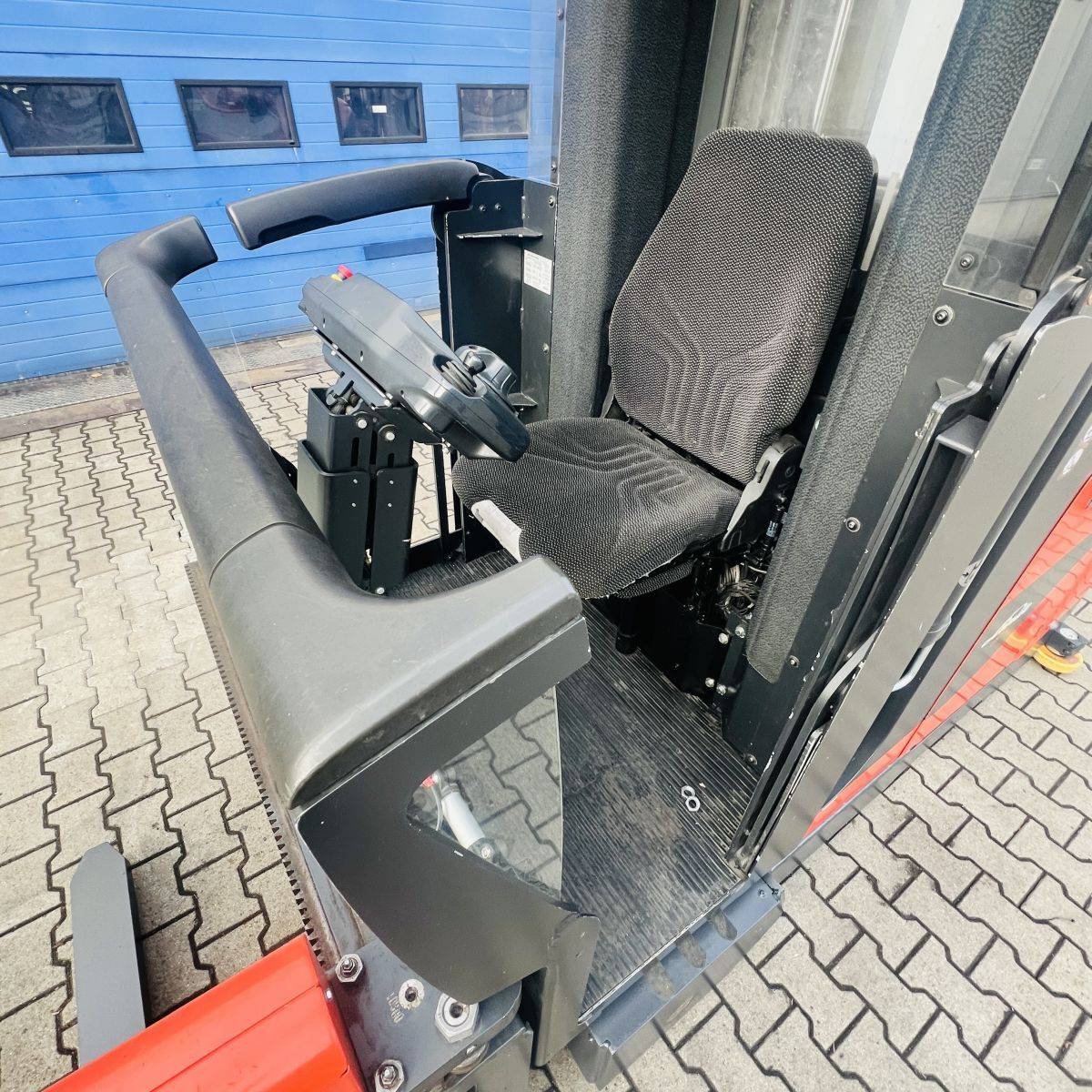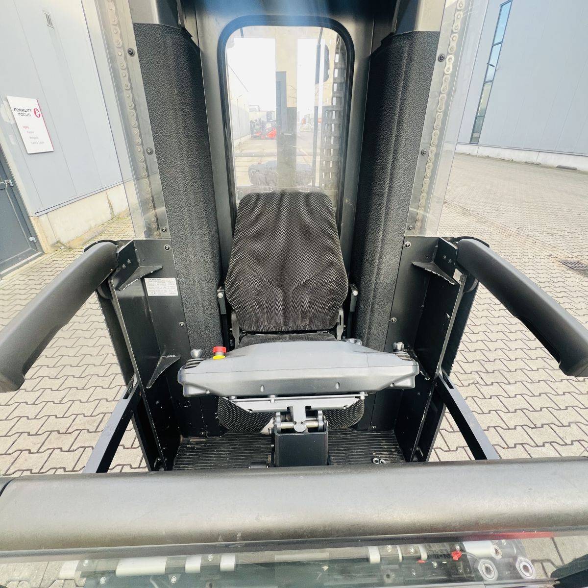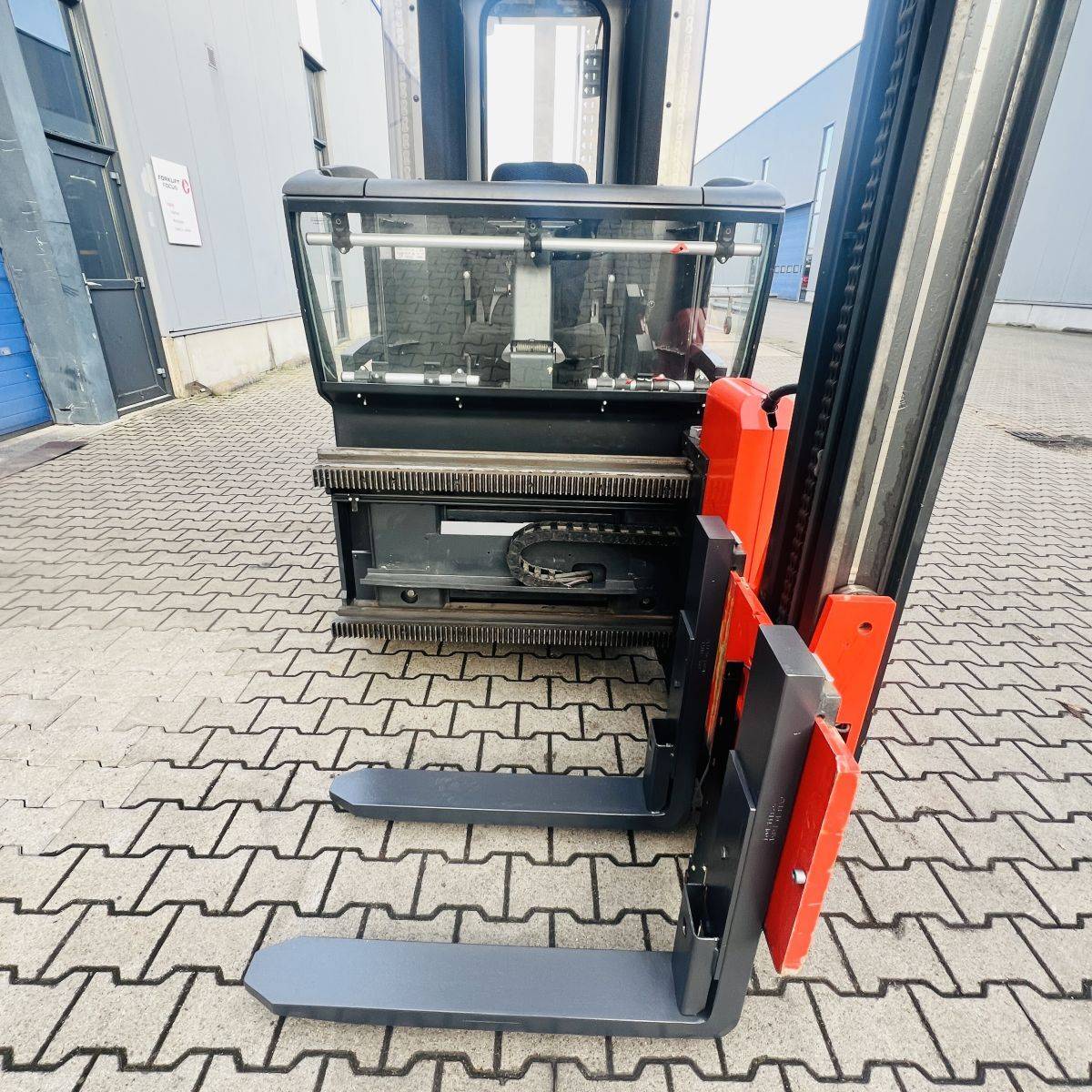 Kombi-Truck with mechanical guidance (4 side-rollers) for aisle width 1.870 mm. H3 forkheight 7.450 mm, H9 supplementary lift 1.800 mm, H25 max forkheight (h3+h9+h13) 9.310 mm. Residual capacity 700 kg @ 430 mm LC @ 8.660 mm. Aisle recognition, Person Detection System (ELOKON PSA).Version 48 Volt (Battery 6PzS 930 Ah).