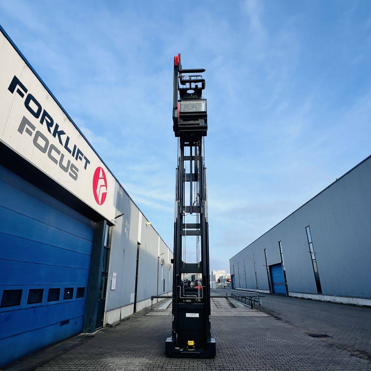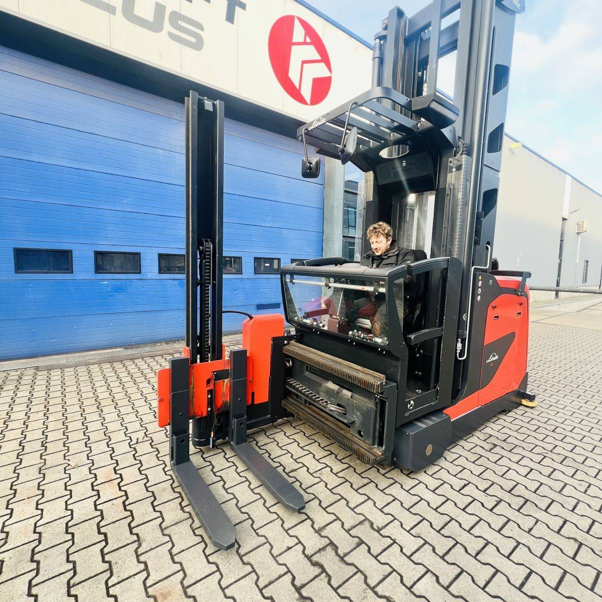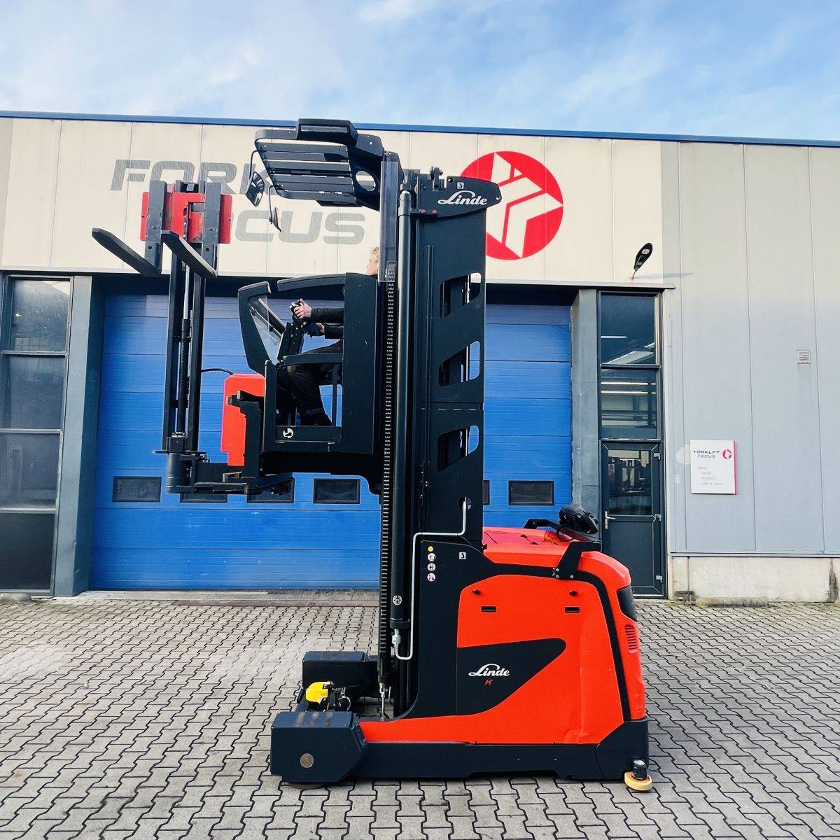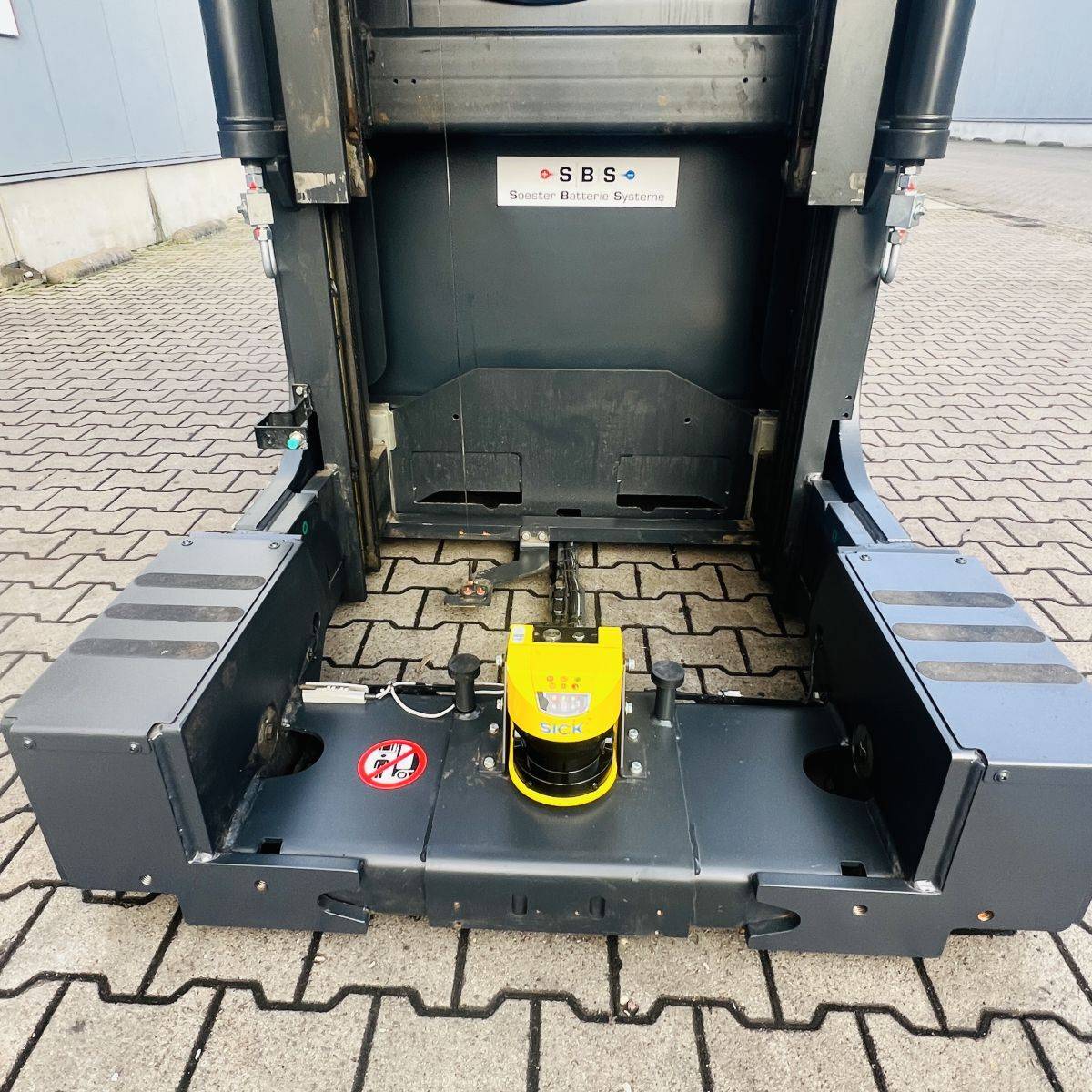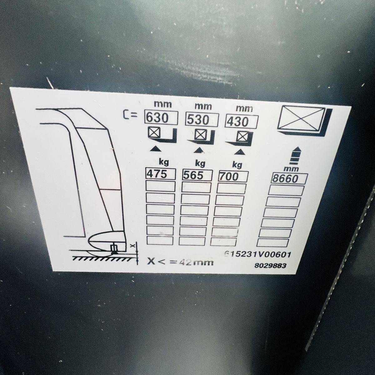 Kombi-Truck with mechanical guidance (4 side-rollers) for aisle width 1.870 mm. H3 forkheight 7.450 mm, H9 supplementary lift 1.800 mm, H25 max forkheight (h3+h9+h13) 9.310 mm. Residual capacity 700 kg @ 430 mm LC @ 8.660 mm. Aisle recognition, Person Detection System (ELOKON PSA).Version 48 Volt (Battery 6PzS 930 Ah).