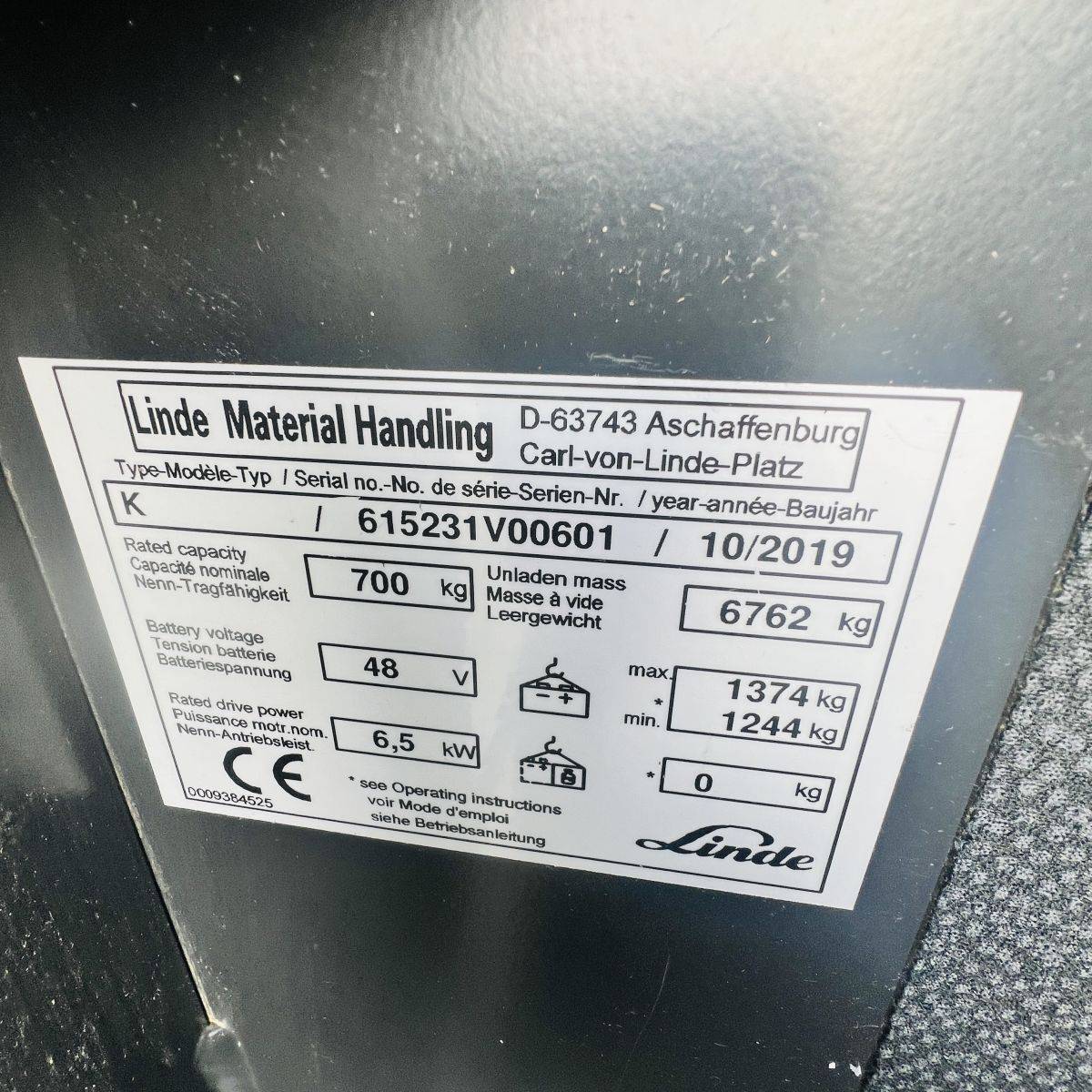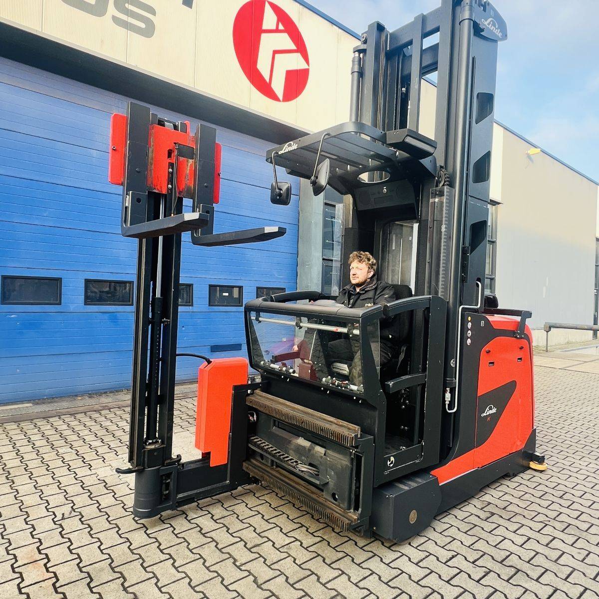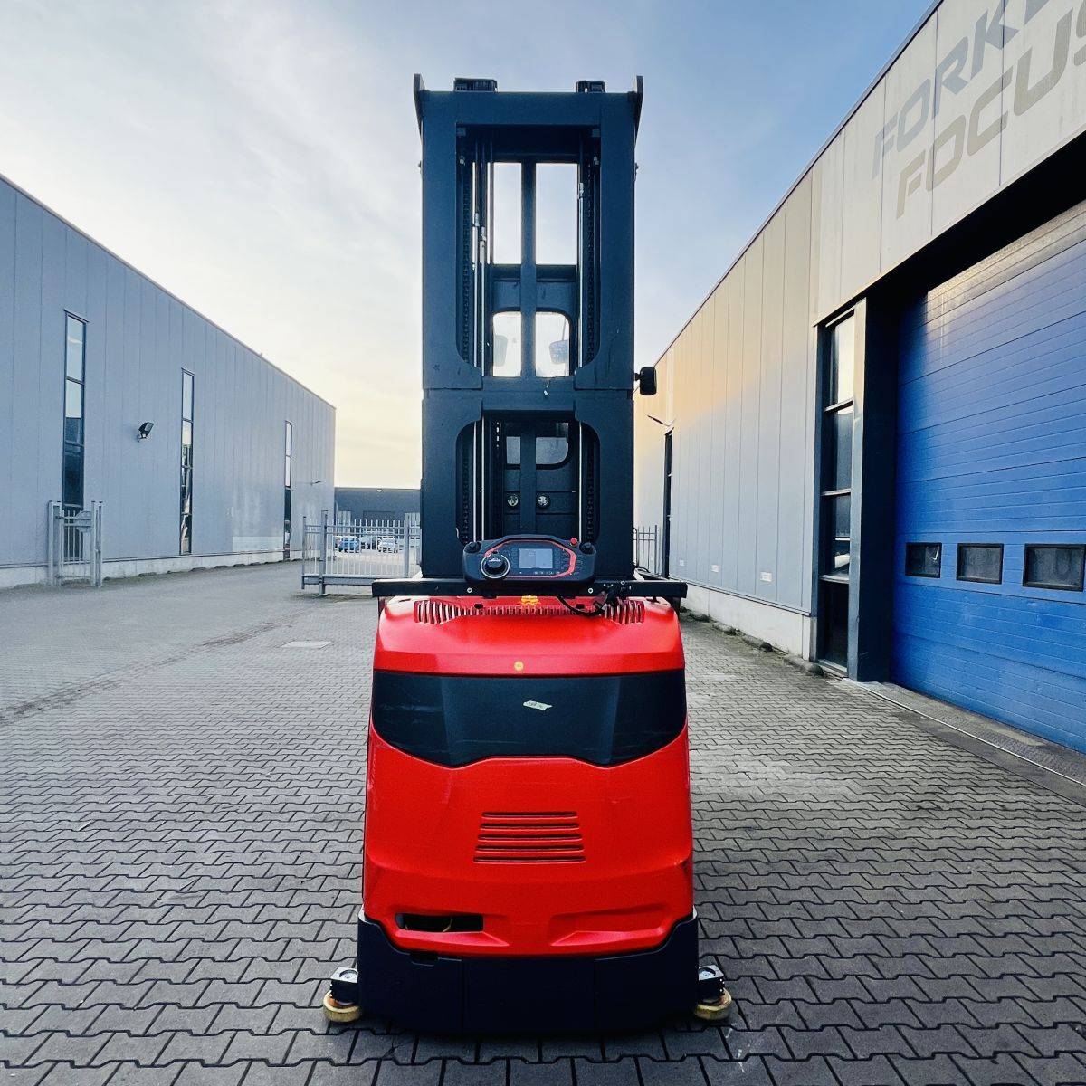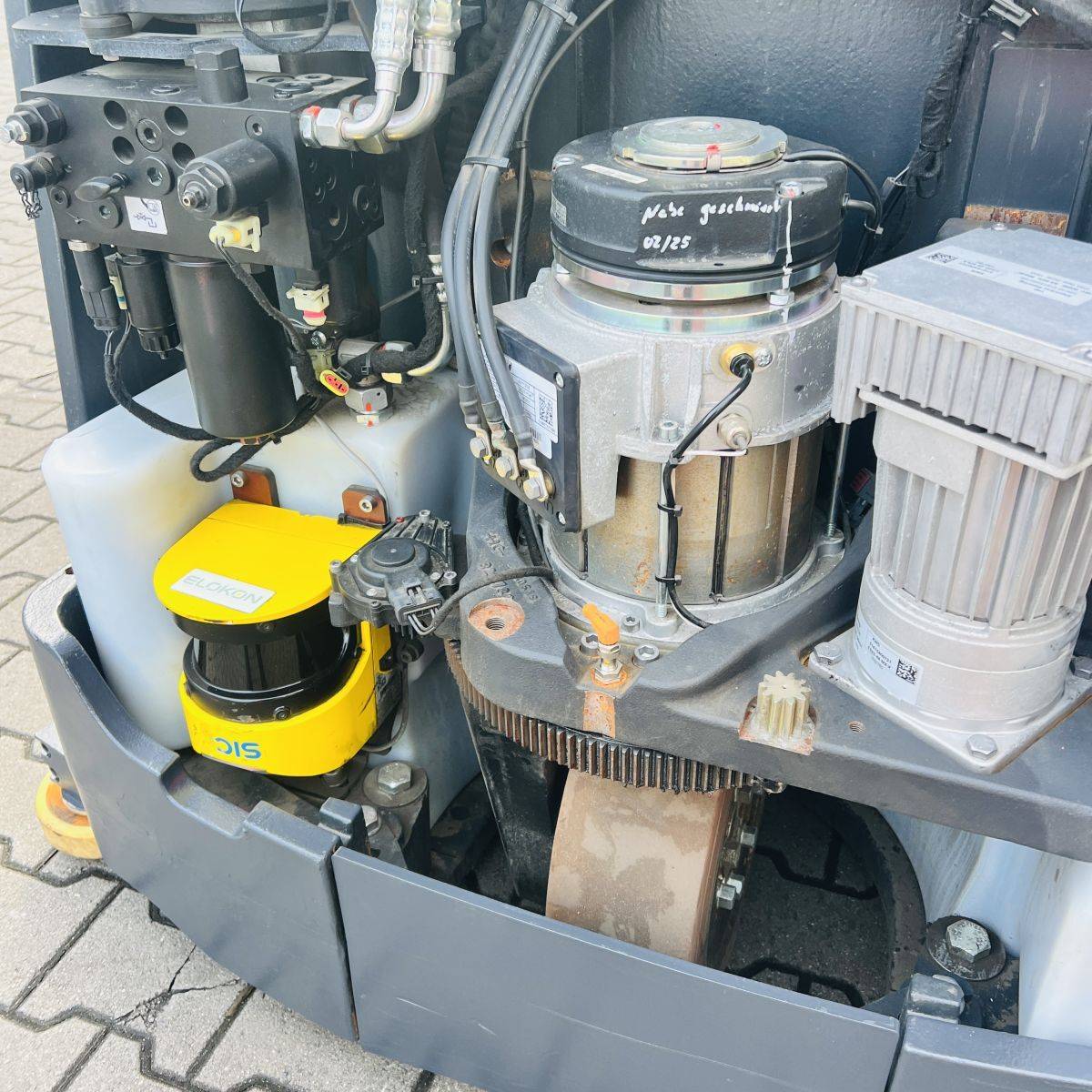 Kombi-Truck with mechanical guidance (4 side-rollers) for aisle width 1.870 mm. H3 forkheight 7.450 mm, H9 supplementary lift 1.800 mm, H25 max forkheight (h3+h9+h13) 9.310 mm. Residual capacity 700 kg @ 430 mm LC @ 8.660 mm. Aisle recognition, Person Detection System (ELOKON PSA).Version 48 Volt (Battery 6PzS 930 Ah).
