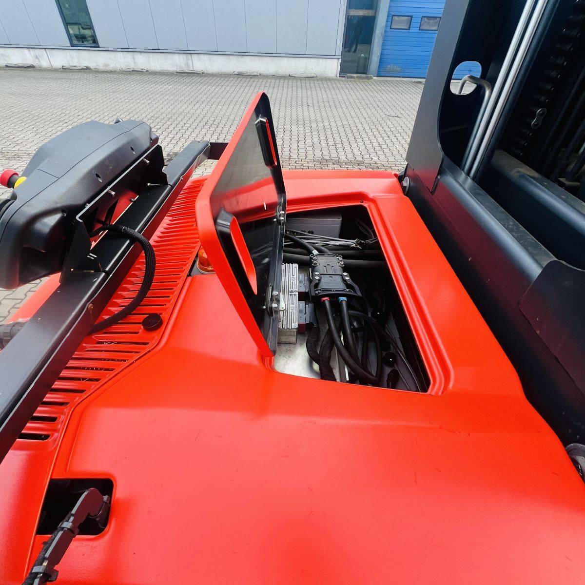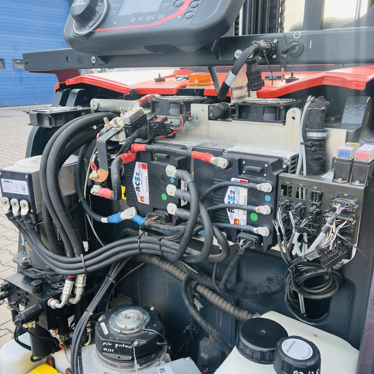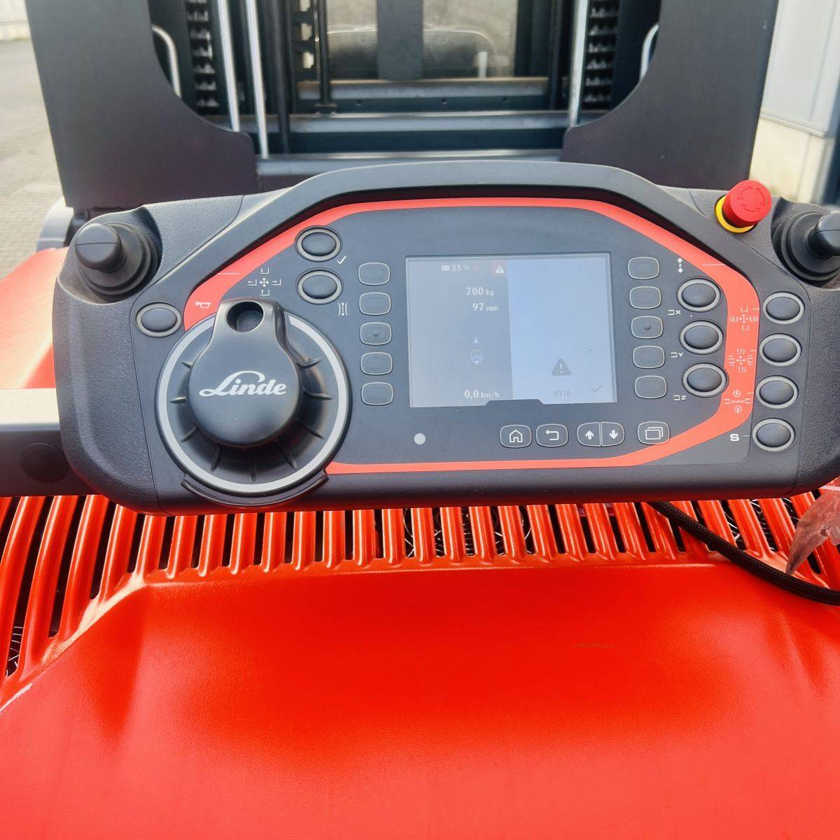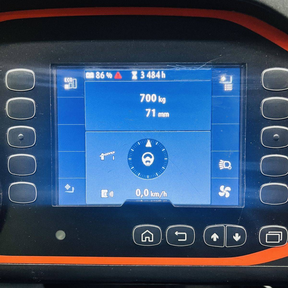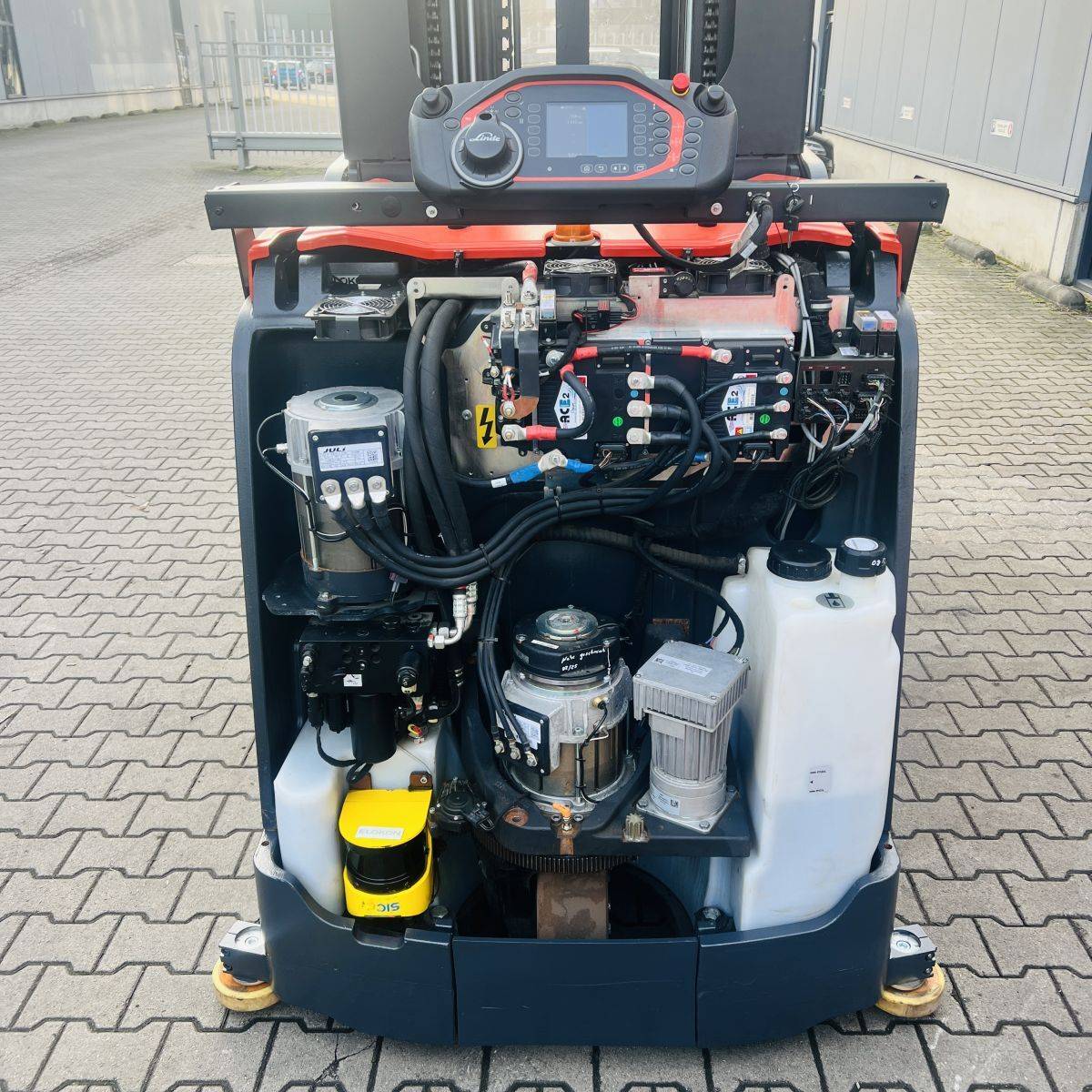Kombi-Truck with mechanical guidance (4 side-rollers) for aisle width 1.870 mm. H3 forkheight 7.450 mm, H9 supplementary lift 1.800 mm, H25 max forkheight (h3+h9+h13) 9.310 mm. Residual capacity 700 kg @ 430 mm LC @ 8.660 mm. Aisle recognition, Person Detection System (ELOKON PSA).Version 48 Volt (Battery 6PzS 930 Ah).