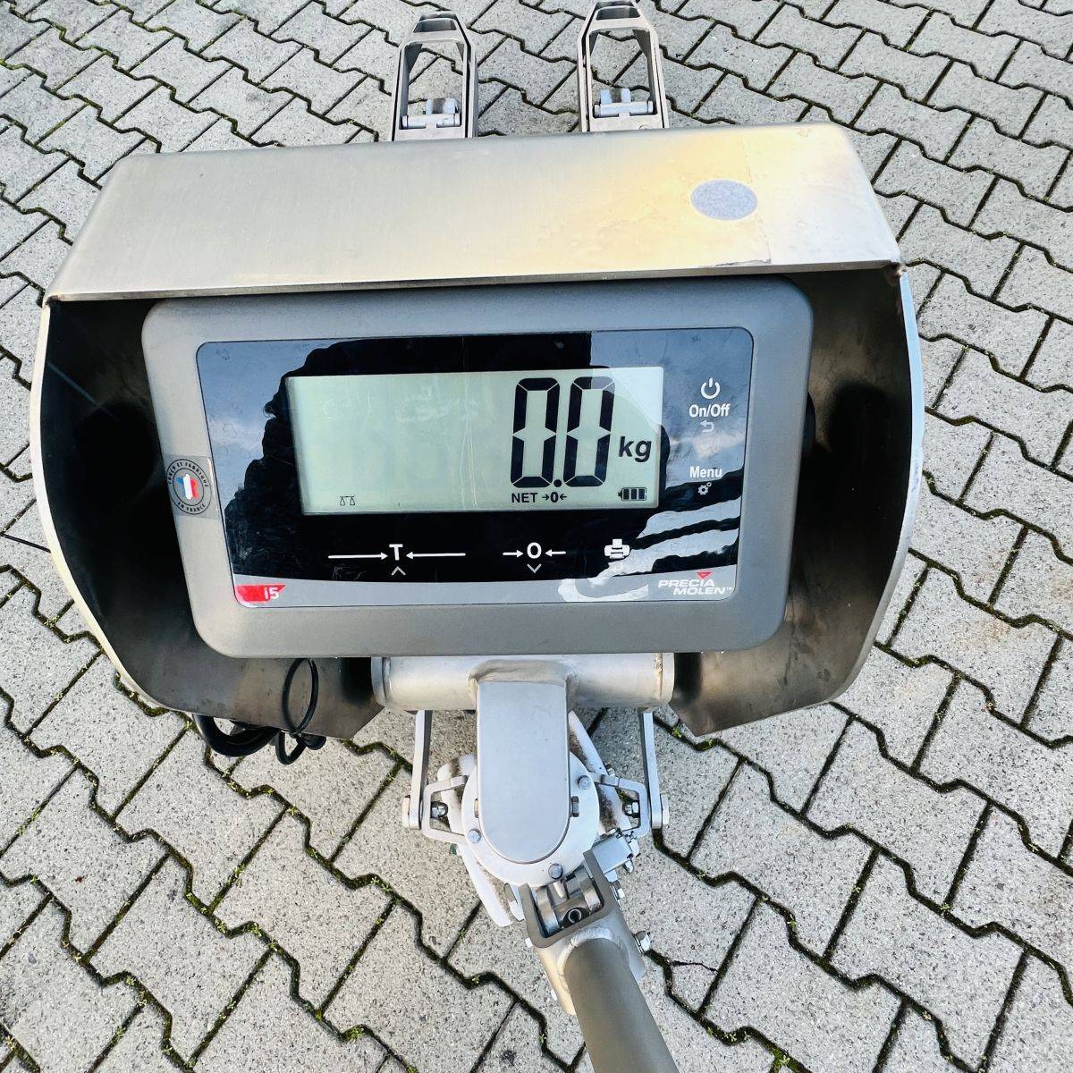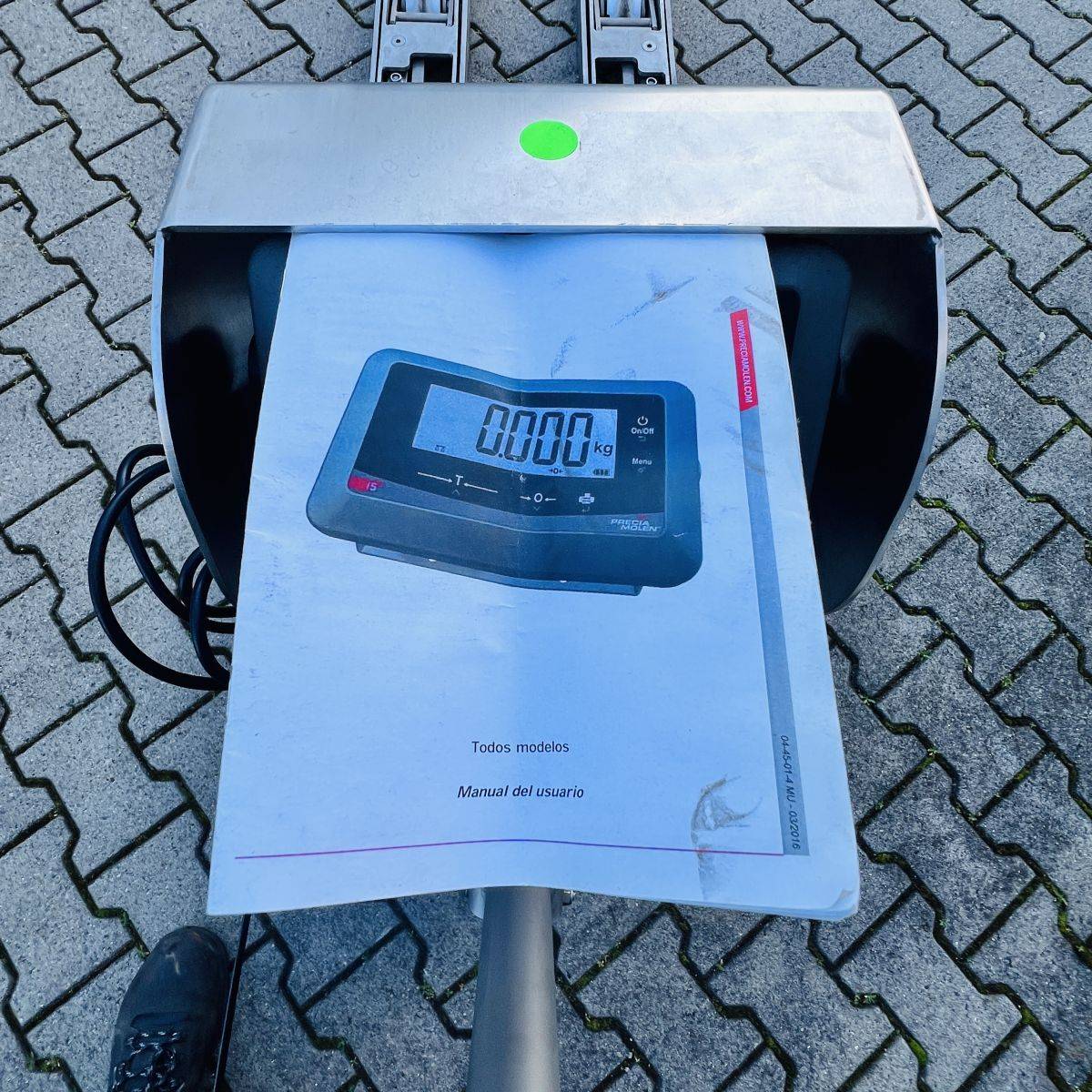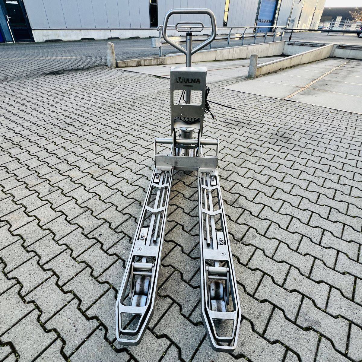 Stainless Steel / Inox Hand Pallet Truck with integral Scale. 1000 kg. weighing capacity. Measuring range from 0 to 1.000kg in 0,5kg intervals, high accuracy: Maximum 0,5%. CIP 68 protected Stainless Steel, IP65 protected Display.