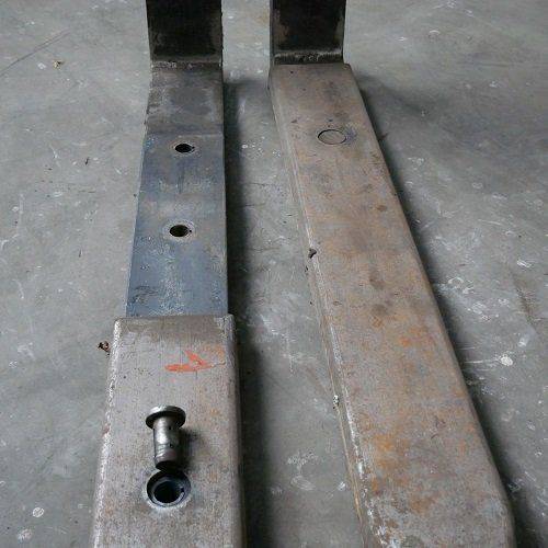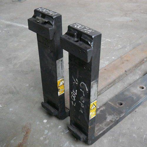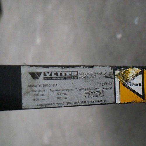Manual Reachforks Manu Tel 25/10/16A, weight 150 kg/piece. Own center of gravity Ret./Ext. = 349 / 480 mmm