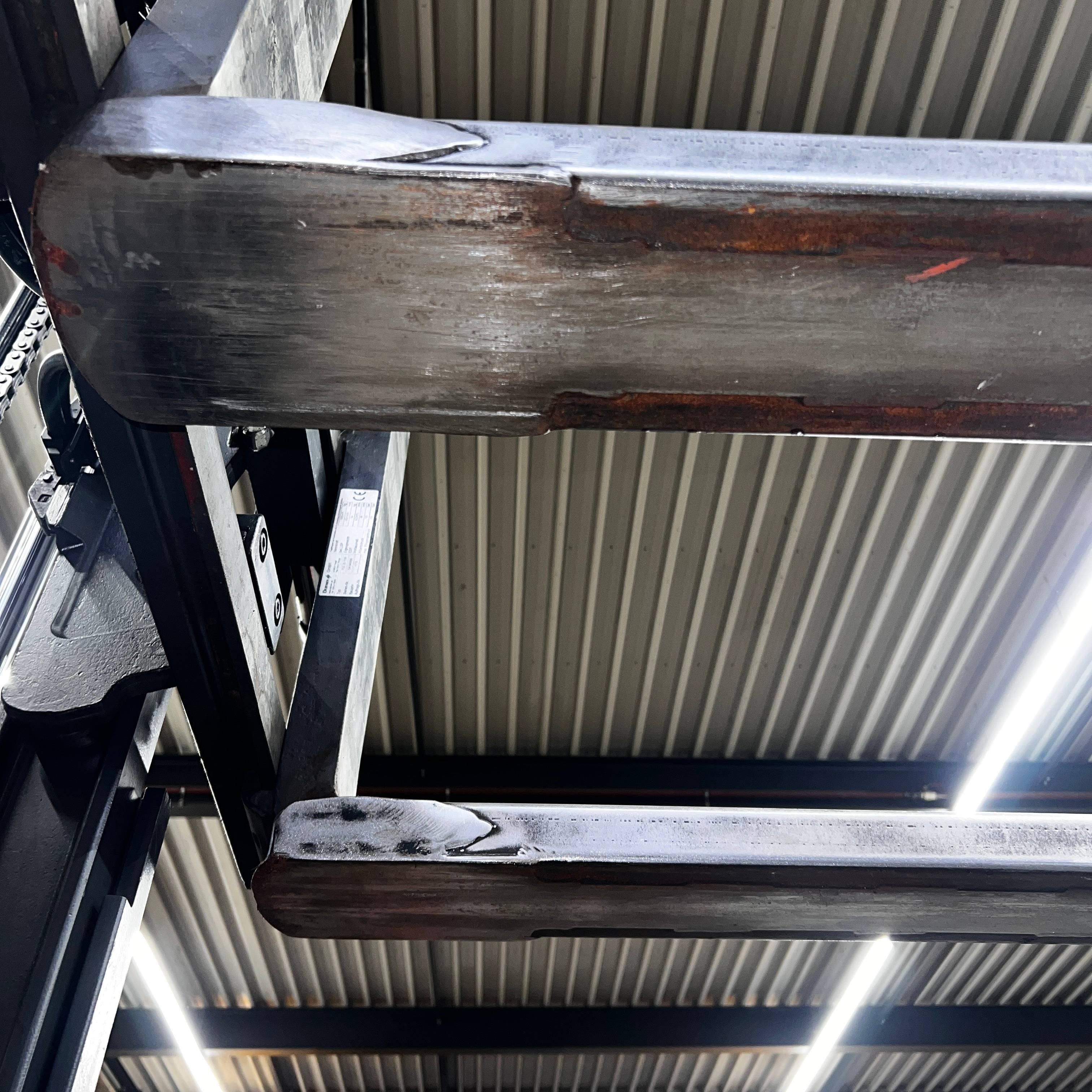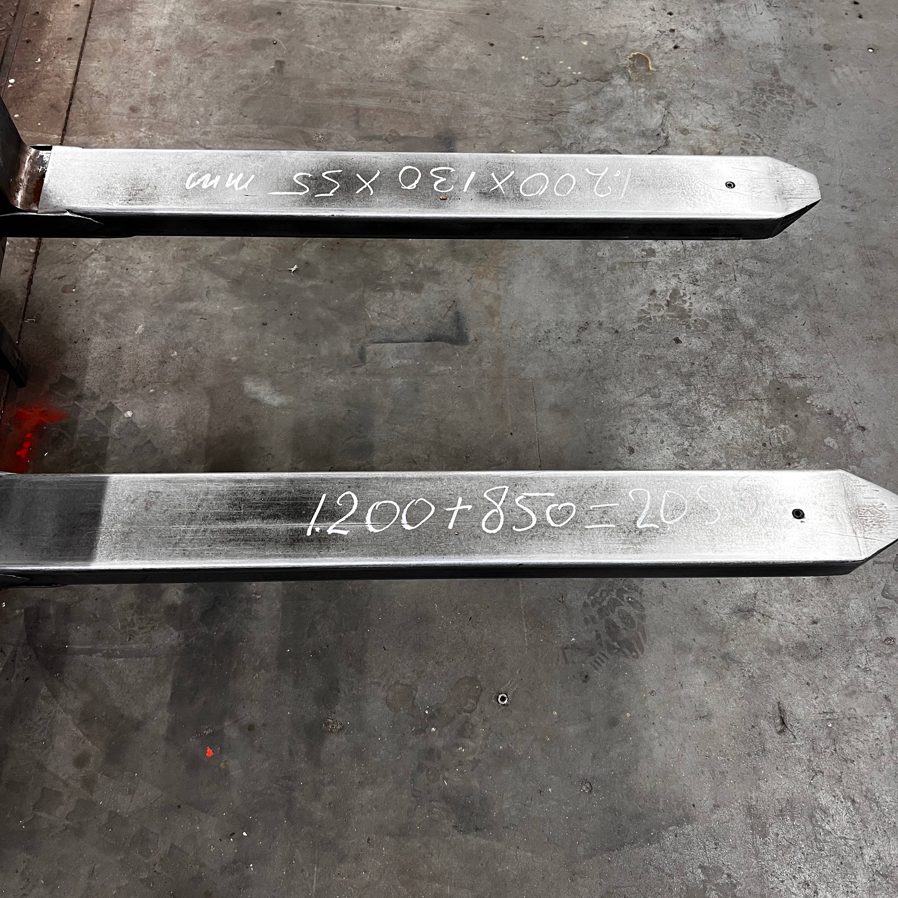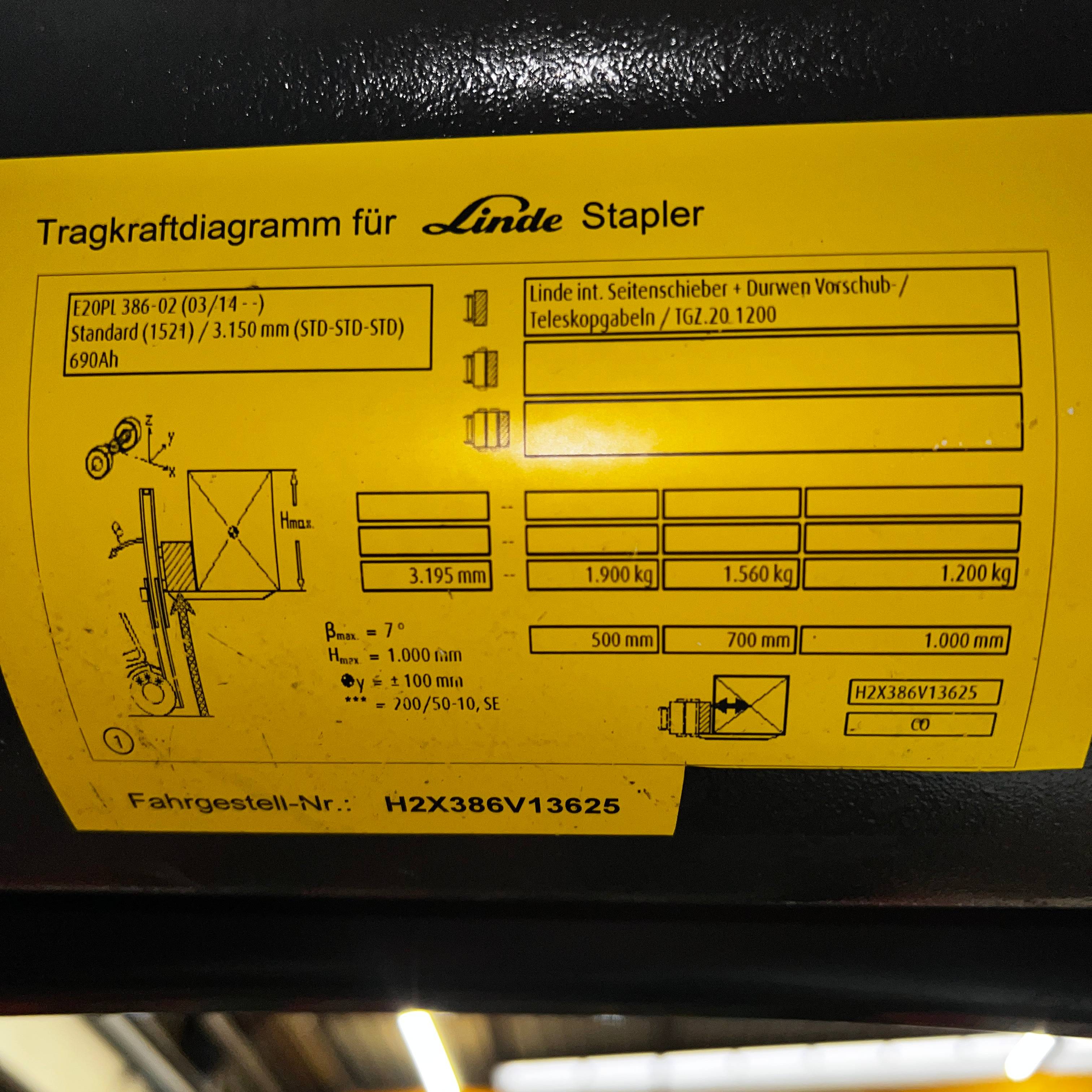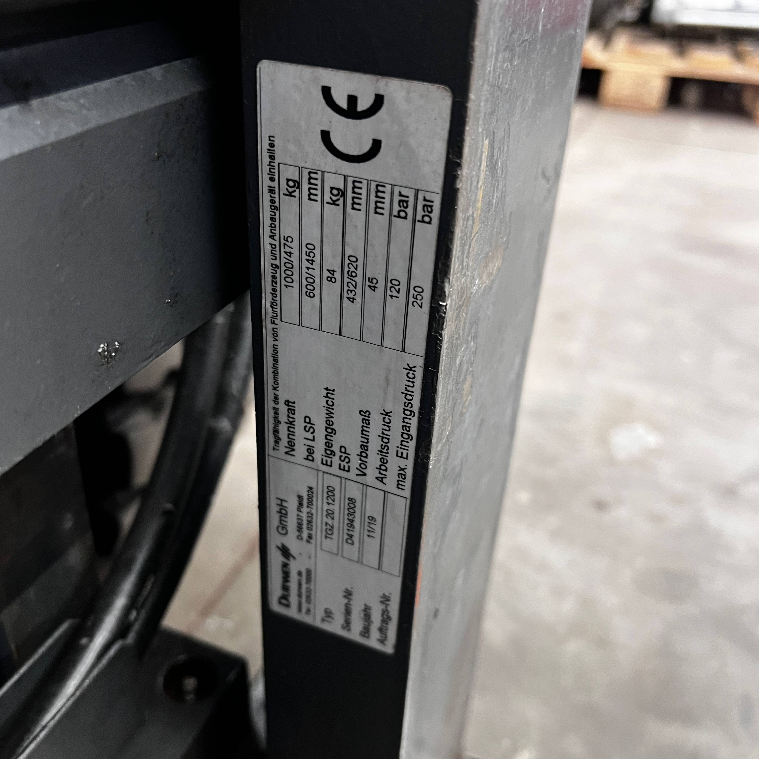 Reach-vorken Dürwen (KOOI), model TGZ20.1200, serie nummer D41943008. Bouwjaar 11/2019. Montageklasse FEM 2A. Capaciteit 1.000 / 475 kg bij lastzwaartepunt 600 respectievelijk 1.450 mm. Afmetingen ingeschoven 1.200 x 10 x 55 mm. Slag 850 mm. Lengte uitgeschoven 2.050 mm. Eigengewicht 84 kg. Afkomstig van een Linde E20PL (2.000 kg heftruck) bouwjaar 2019 met 1.820 bedrijfsuren. Zie restdraagdiagram. Vorken in zeer goede staat, video 141125 beschikbaar.