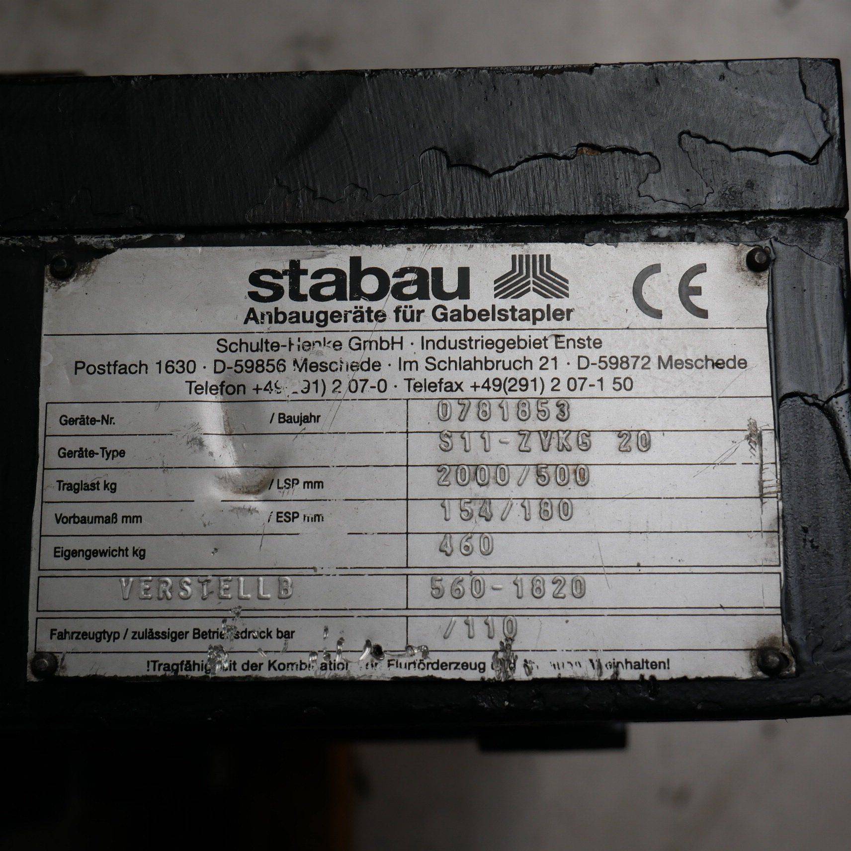 Stabau Fork positioner with separate side shift Type S11-ZVKG 20. Frame width 1150 mm. Self weight 460 kg. Lost thickness 154 mm. Own center of gravity 180 mm. Opening over forks 560-1820 mm